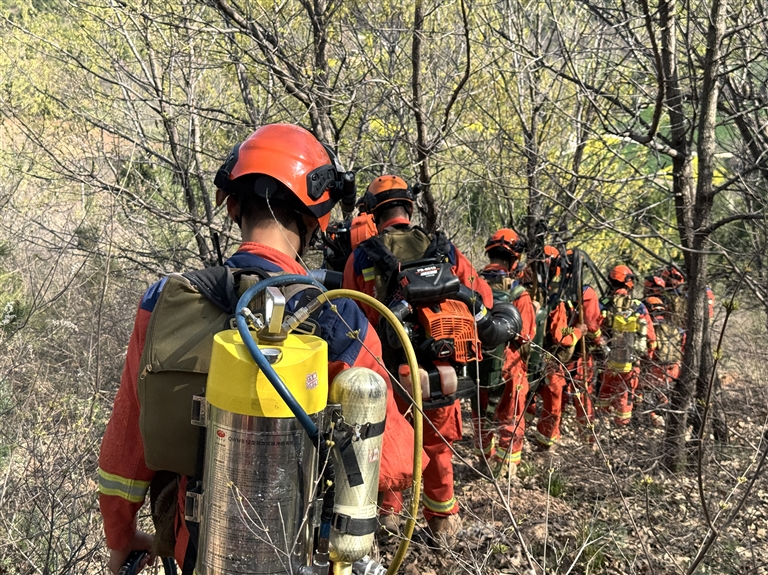 4月1日,郑州市林业局森林防火应急大队靠前驻防的新密市伏羲山防火队队员携带森林防火装备正在开展林区巡防巡护。王璐瑶 摄