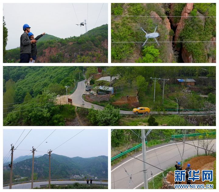 4月7日,国网郑州供电公司配电运维班工作人员在荥阳市环翠峪风景名胜区开展专项巡视(拼版图片)。(肖筱 摄)