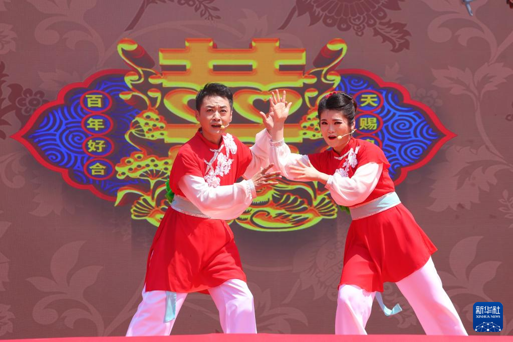 4月18日,在河南省南阳市社旗县赊店古镇市民广场,演员在赊店书会系列展演活动上表演节目。